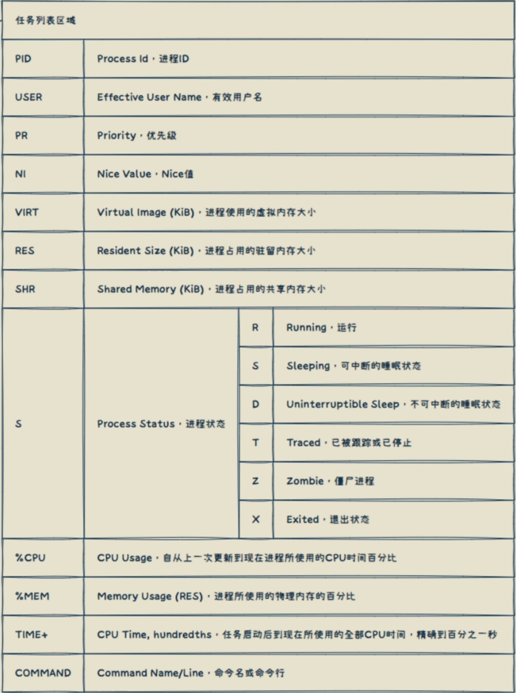 TIME+CPU Time,hundredths,任务后动后到现在所使用的全部CPU时间,精确到百分之一秒